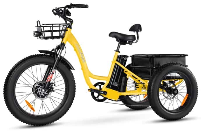 This makes it an ideal companion for lengthy outdoor excursions or urban errands. Its unique design is characterized by a step-thru frame crafted from resilient 6061 Aluminum Alloy at the front and 7A19 Aluminum Alloy at the rear. The trike’s ample storage solution comes in the form of a waterproof basket bag boasting an impressive 48L capacity, making it perfect for transporting groceries or other essentials.